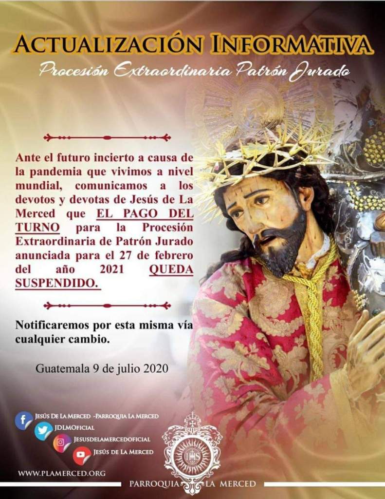 En este día la Parroquia Nuestra Señora de la Merced, informa a los devotos de Jesús Nazareno, que queda SUSPENDIDO EL PAGO para la Procesión Extraordinaria por los Trecientos Años del Nombramiento de Patrón Jurado. La cual fue anunciada para el veintisiete de Febrero del año 2021.